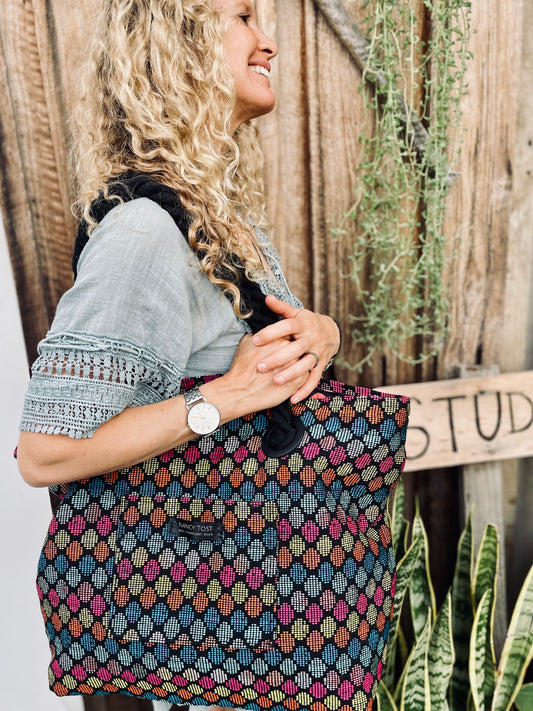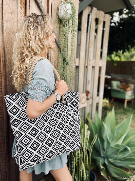 The bag journey started after I bought a bag from a surf shop that broke after 5 minutes. I thought I could do better than that so I made one and loved it! It has since lasted me 10 years as a beach bag, due to the upholstery fabric and quality parts! I have continued to sew a few of these for the Margaret River Open Studios event and now for my online store!