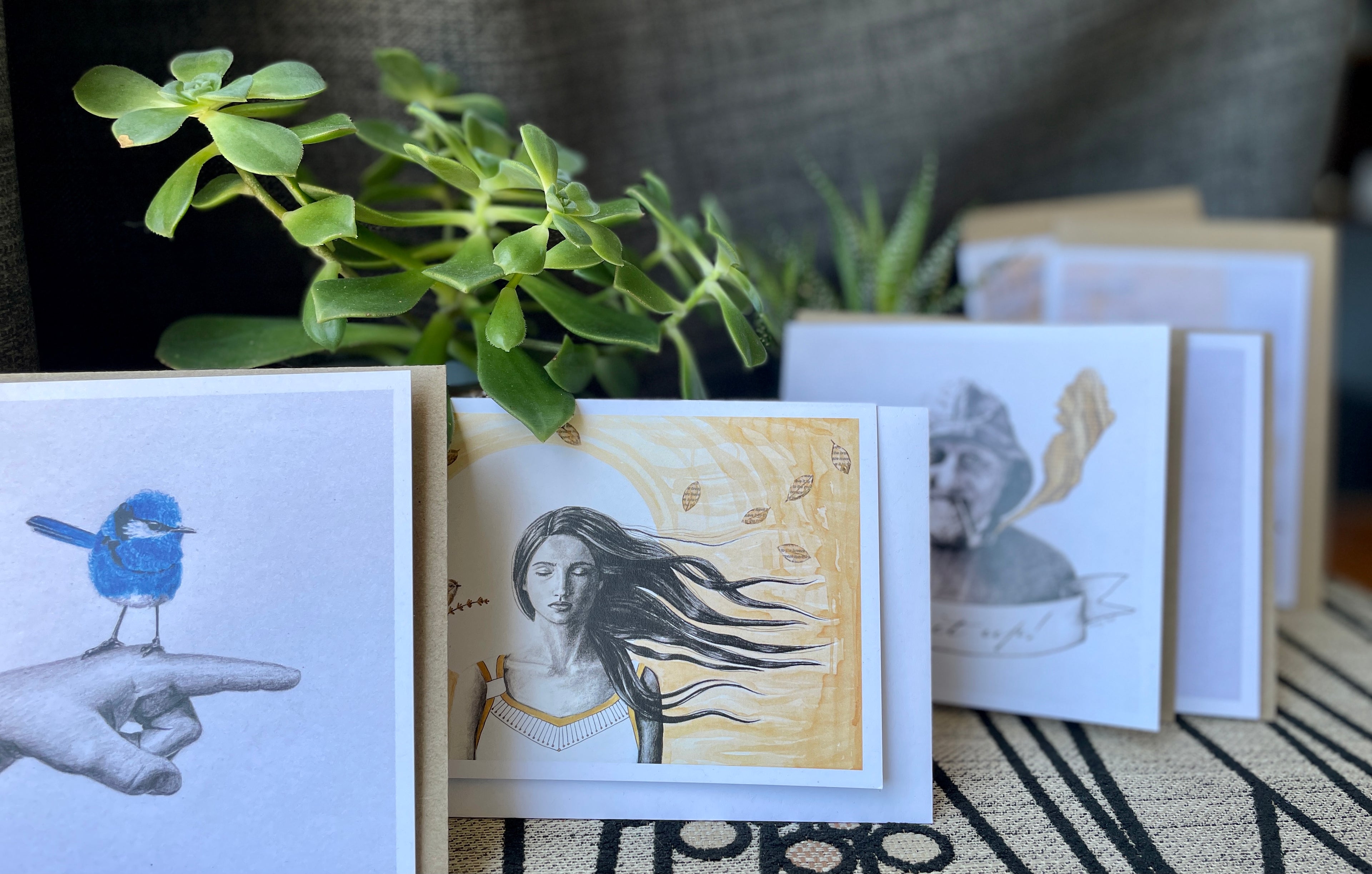 Beautifully printed gift cards of my original artwork, printed in Western Australia on 100% recycled paper. All cards come with either a Kraft brown envelope or an eco star 100% recycled envelope.