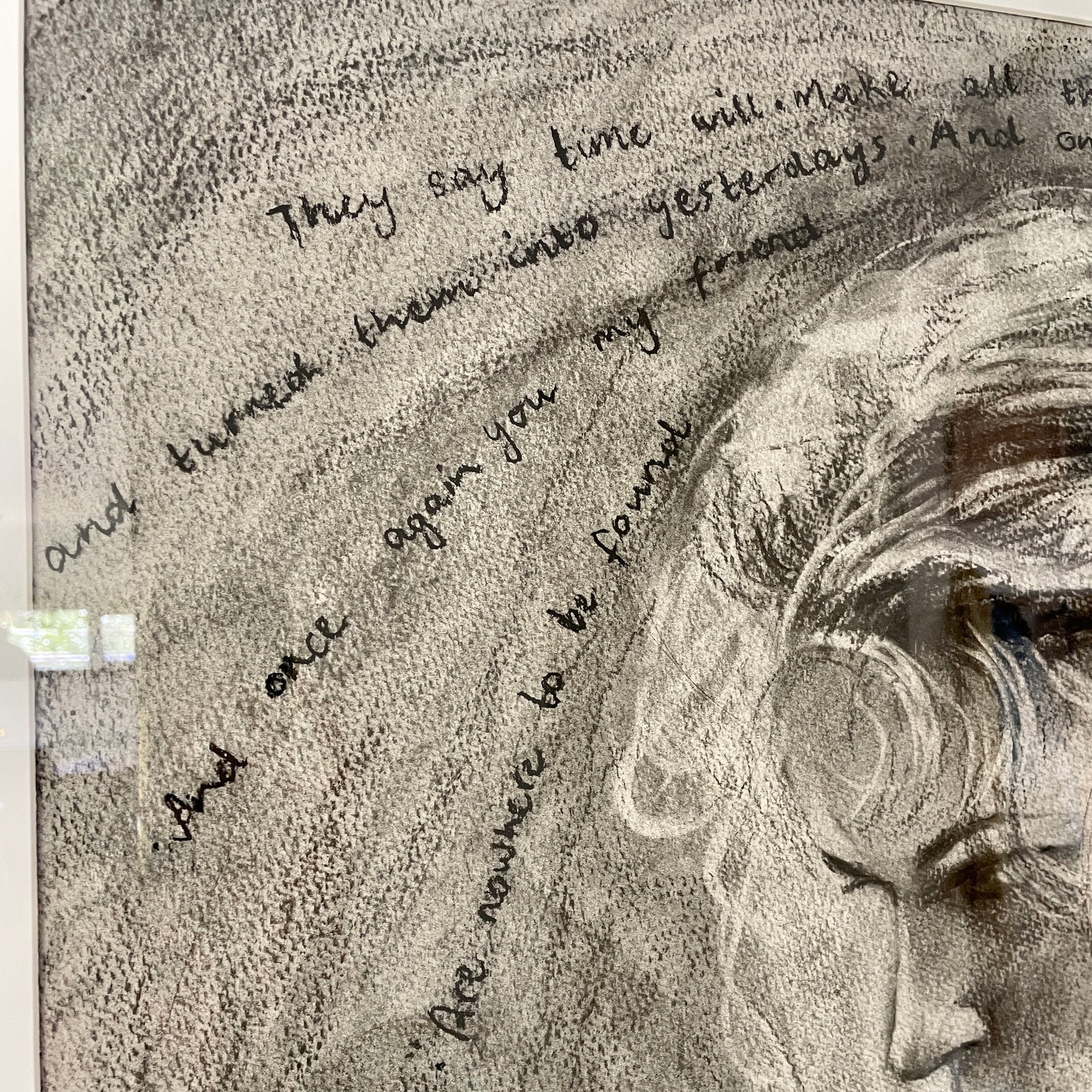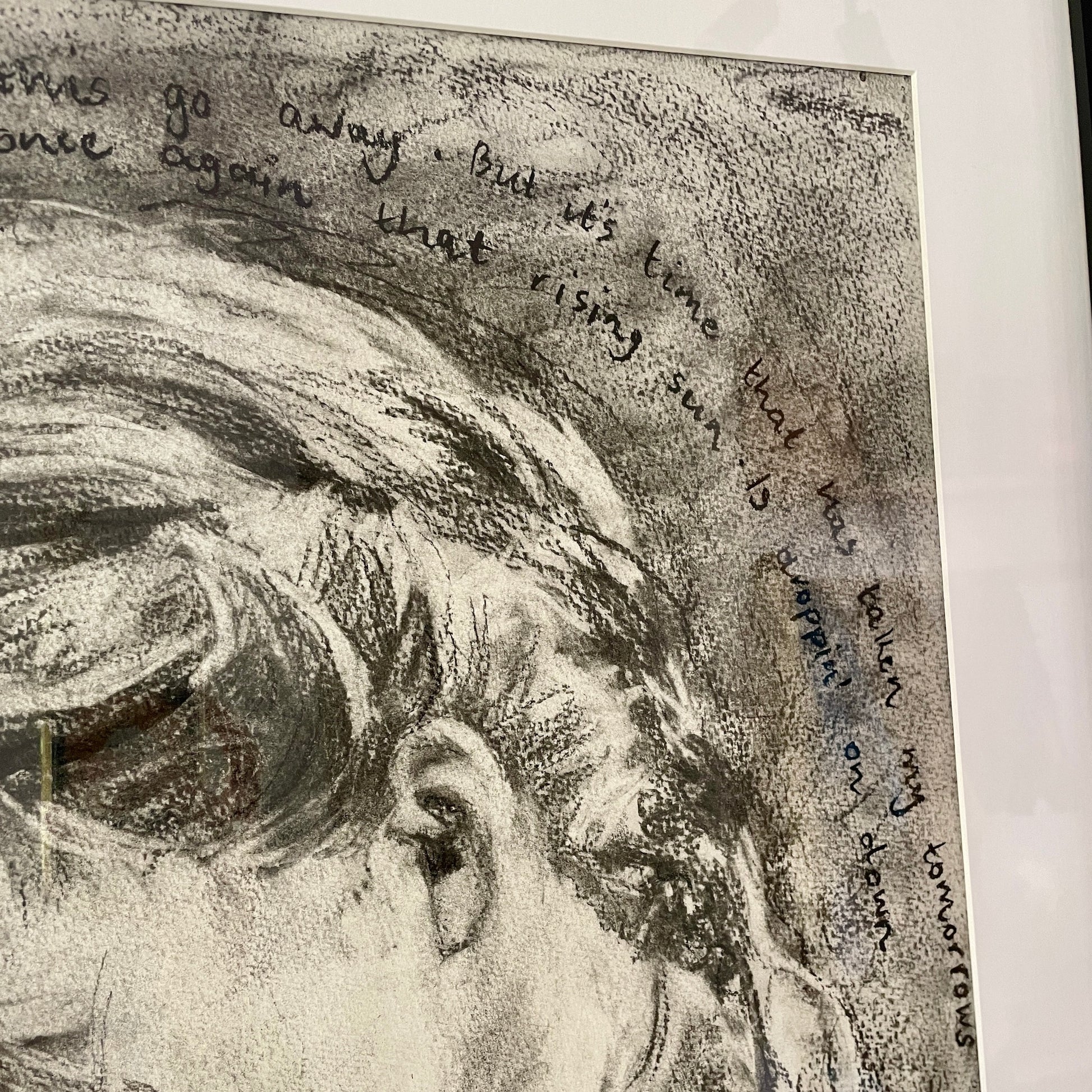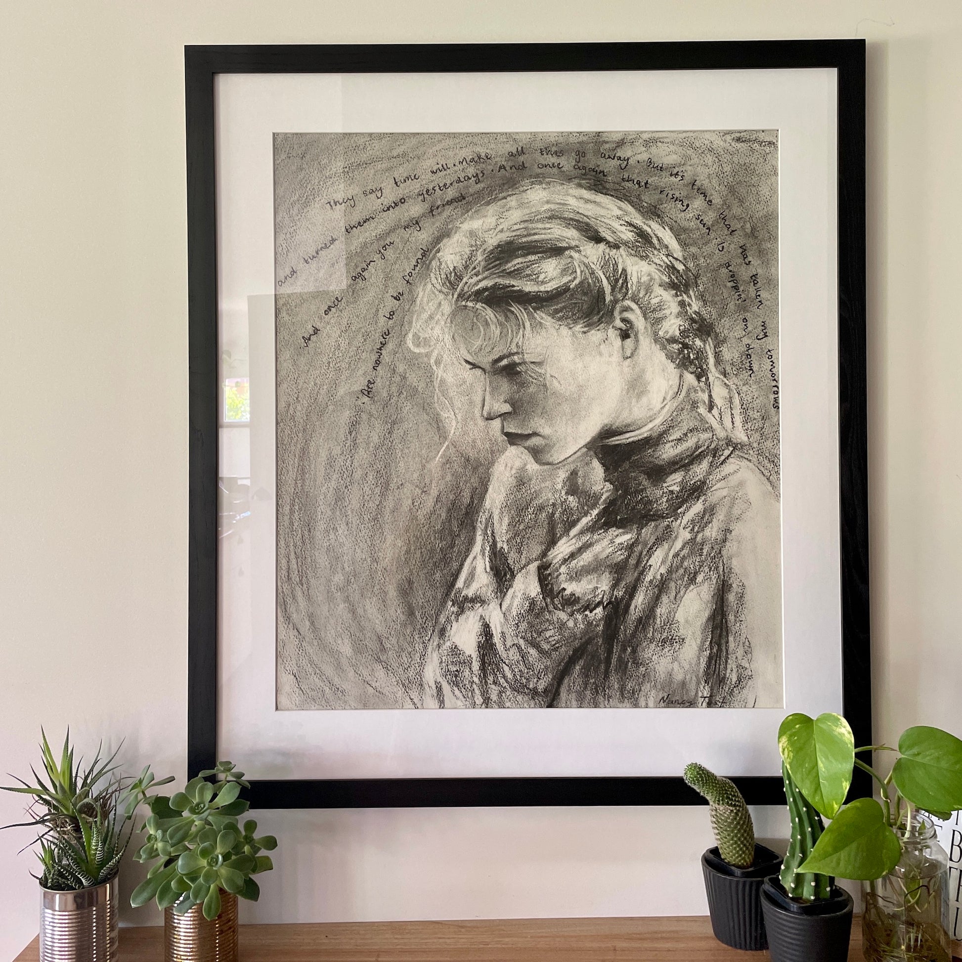 This charcoal drawing was done a long time ago when a special friend passed. I was in my 20's and it was a life changing event. In some way I feel like my life began at this point as it opened my eyes. Special friends and music meant more than ever and so the words are from a Ben Harper song I was listening to a lot at the time. This picture has finally been professionally framed this year and is ready to be on the wall in someones home. My hope is that is brings you the comfort and love that it brought me when I was going through a hard time. It truly is a beautiful piece.