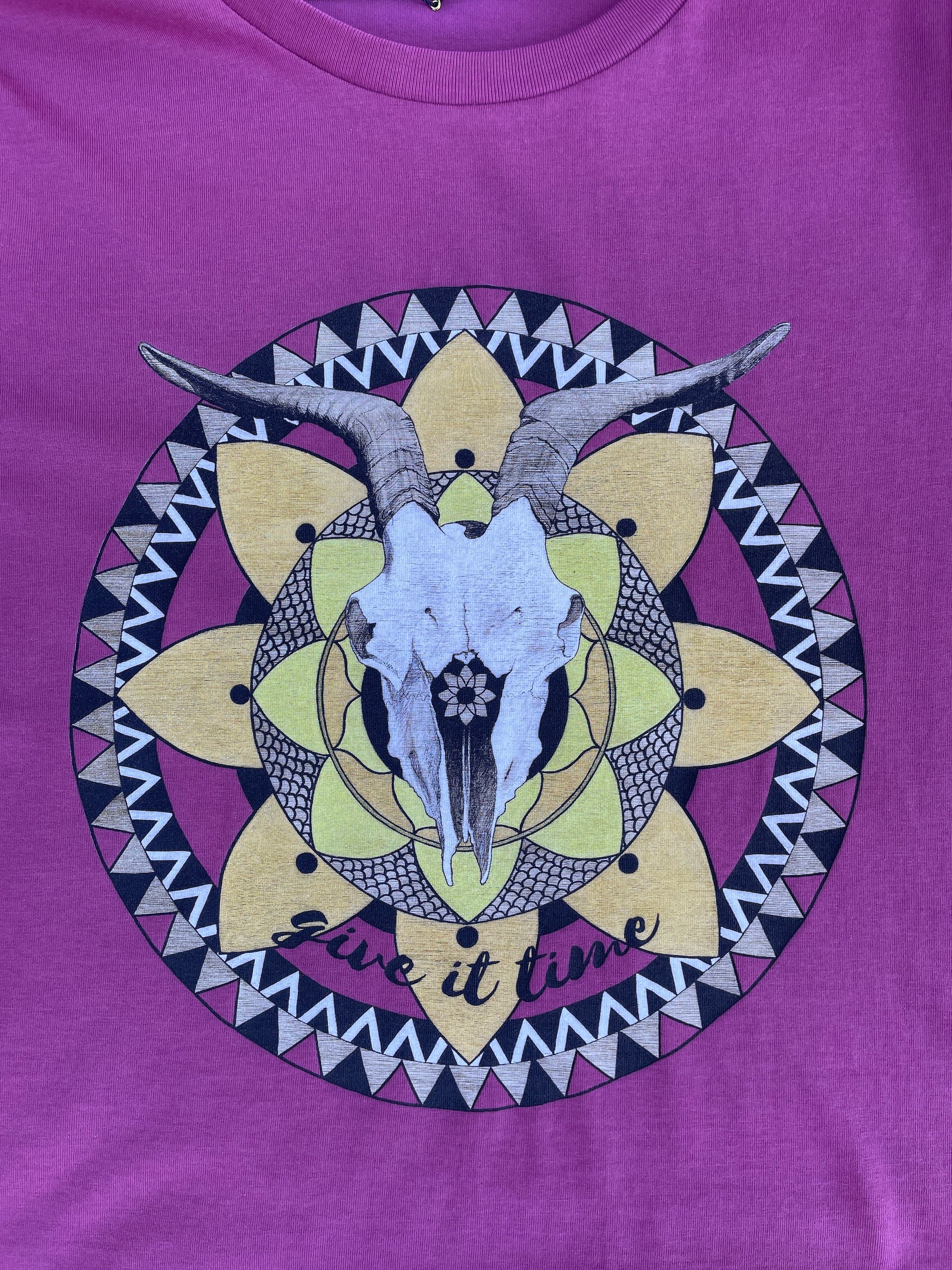 This design came about after a good friend passed. He loved finding goat skulls and this one was found by two of his good friends on a special day. I sat up in the middle of the NW dessert with a knee injury and drew it on wood. The title is constant phrase we all say and relates so much to this story. Getting the image ready for print was a challenge but we got there thanks to excellent local printers and I love it! I hope you do too!