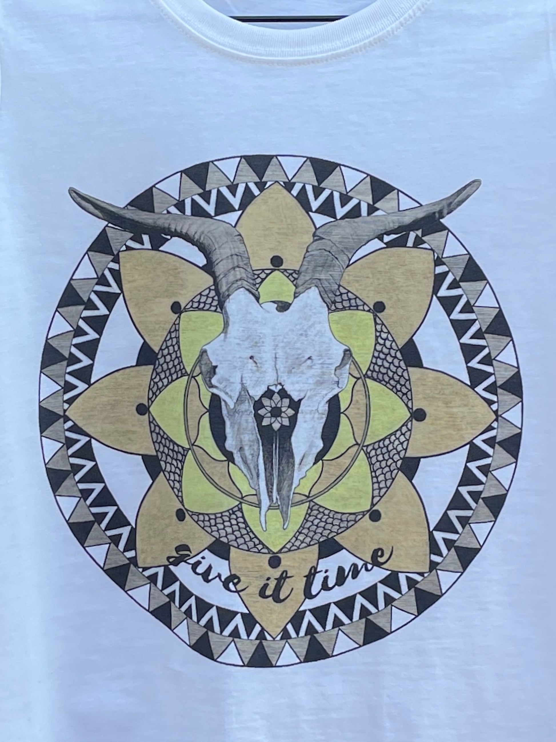 This design came about after a good friend passed. He loved finding goat skulls and this one was found by two of his good friends on a special day. I sat up in the middle of the NW dessert with a knee injury and drew it on wood. The title is constant phrase we all say and relates so much to this story. Getting the image ready for print was a challenge but we got there thanks to excellent local printers and I love it!