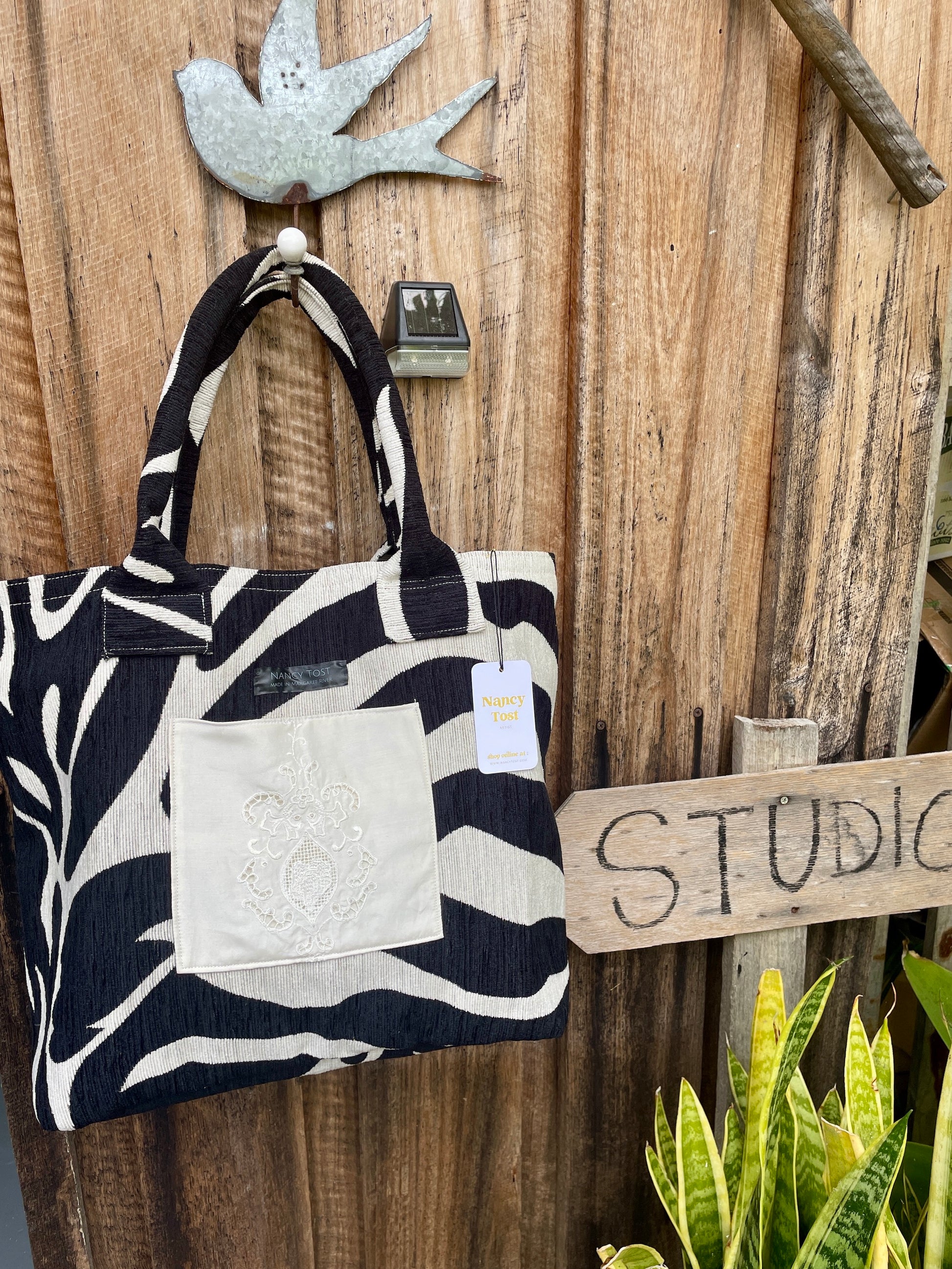 The bag journey started after I bought a bag from a surf shop that broke after 5 minutes. I thought I could do better that so I made one and loved it! It has since lasted me 10 years as a beach bag, due to the upholstery fabric and quality parts! I have continued to sew a few of these for the Open Studios event and now for my online store. This bag has handmade handles lined with foam so its even more comfortable to carry. 100% organic cotton lining and an embroidered silk outside pocket.