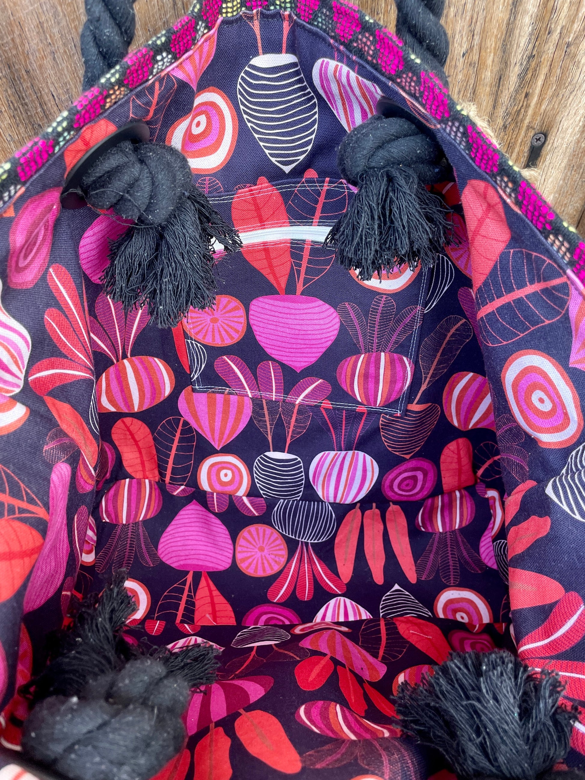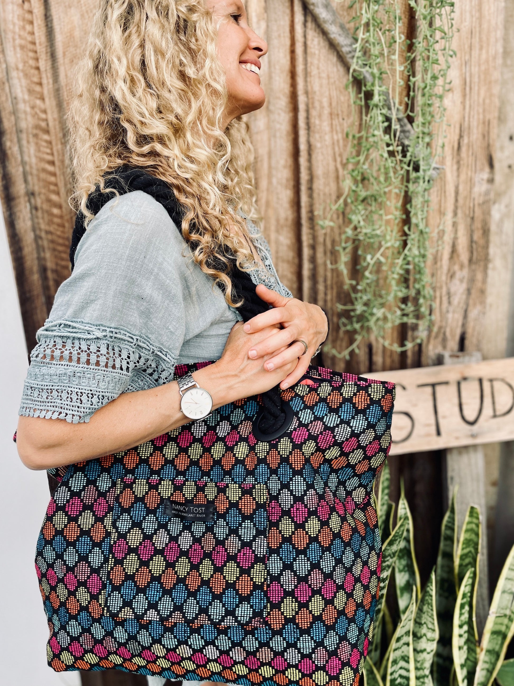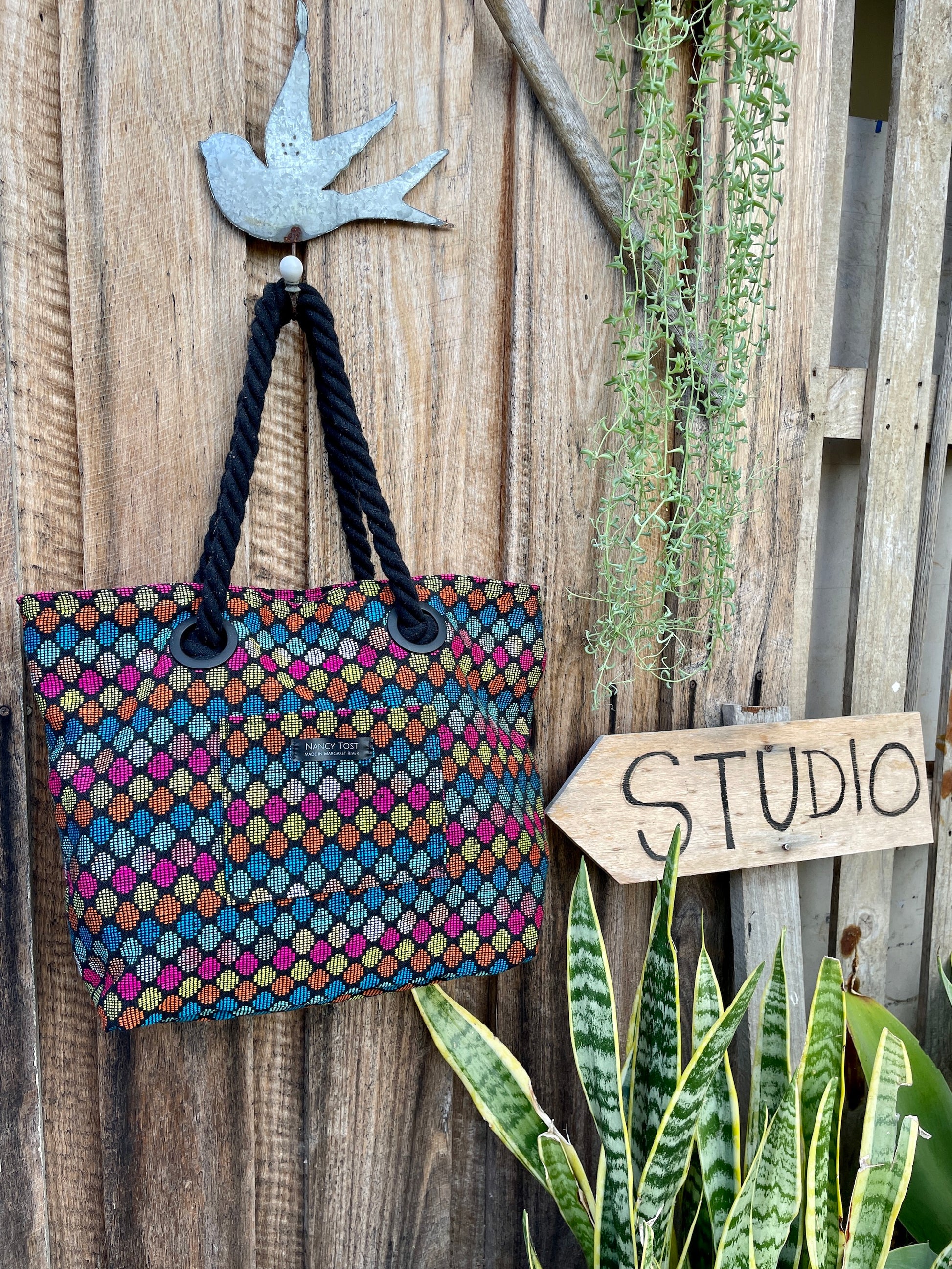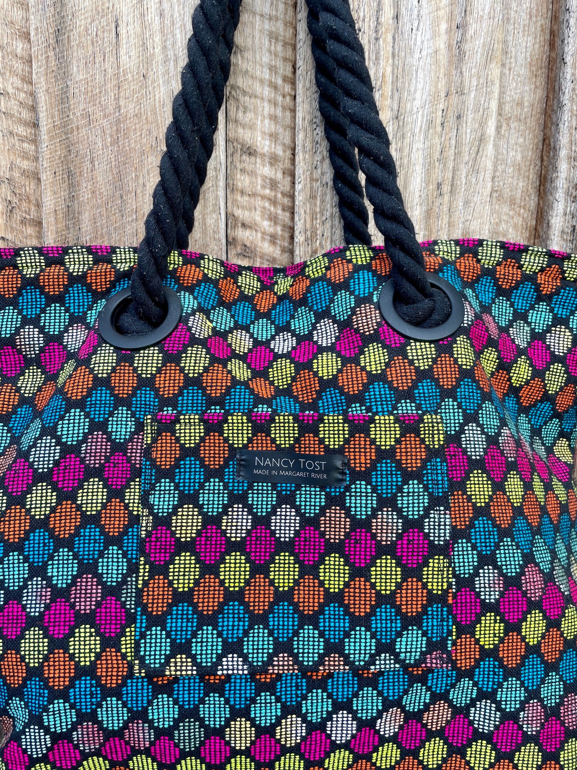 The bag journey started after I bought a bag from a surf shop that broke after 5 minutes. I thought I could do better that so I made one and loved it! It has since lasted me 10 years as a beach bag, due to the upholstery fabric and quality parts! I have continued to sew a few of these for the Open Studios event and now for my online store!