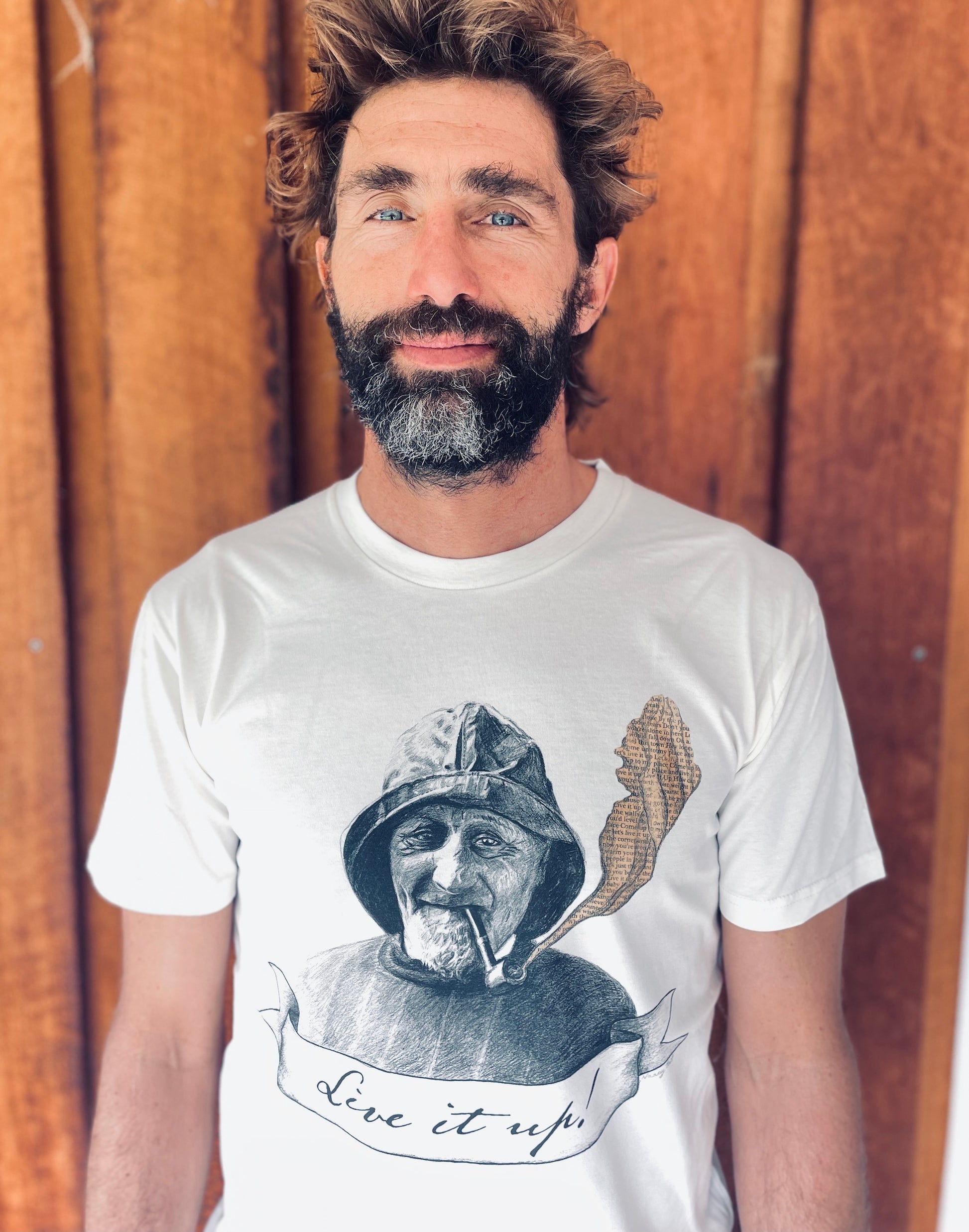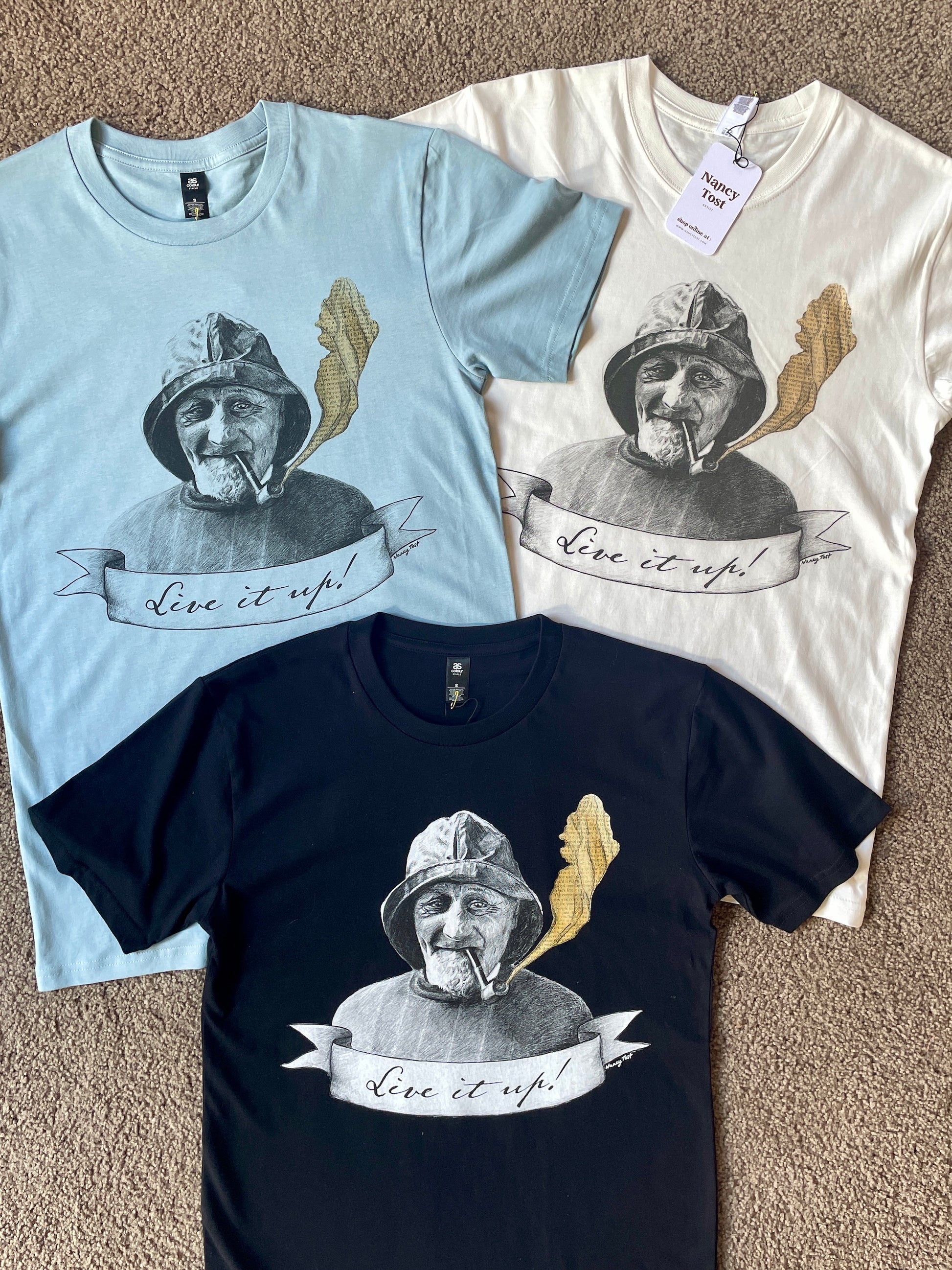 Live it Up is an old salty sea dog that is a true hero of his time. A man of the sea who lived a life rescuing others from drowning, in treacherous conditions. He is as authentic as it gets and is someone I'd like to have a yarn to over a cold one. Live it up became his banner as the original commission, that fell though due to covid, was for a Surf Shop that is dear to me and Live it Up was their slogan penned by Taj Burrow. A phrase we know well, here in WA.