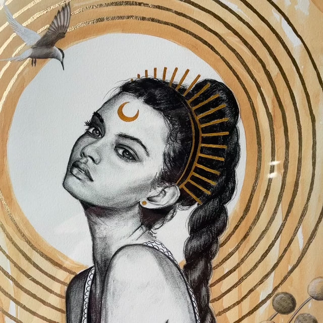 This is a Giclee print of the original artwork by Nancy Tost. Love is the Answer is part of a Gratitude series I started earlier in the year. When we least expect it life lessons pop up, and how we handle ourselves in these situations helps us grow. When I was creating this piece we were facing some challenges in high school and so she became the deity for this time. The Arctic Tern symbolises endurance, resilience and tenacity. Gold leafed circles around the sun and gold acrylic paint on her crown and forehead. Text in some of the Billy Buttons states "love is the answer" and coloured in gold ink. This print has been hand embellished.