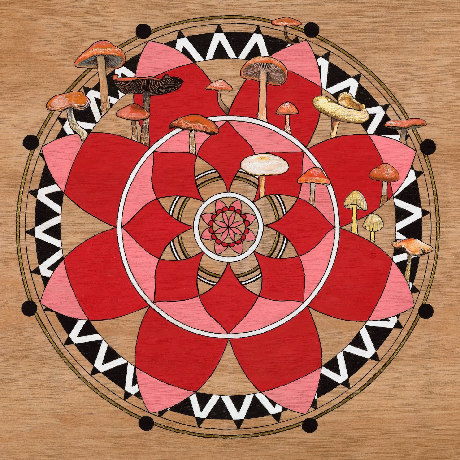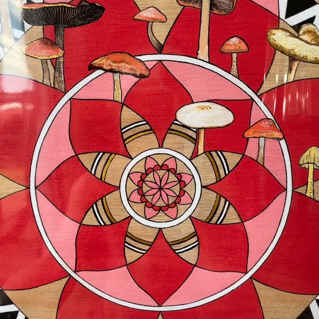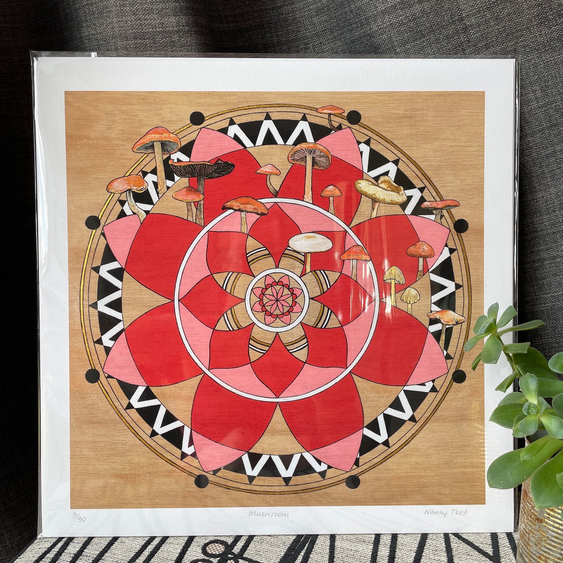 This is a Giclee print of the original artwork by Nancy Tost. The mandala series I did was a journey of my own healing. After a health scare I was drawn to these patterns and without knowing it I was self medicating, creating mandalas to help with my PTSD. There are 6 in this series, all drawn on wood and so the prints have a wonderful texture and warmth to them. These mushrooms are from around my garden and spotted on walks around the Margaret River. This print has been hand embellished.
