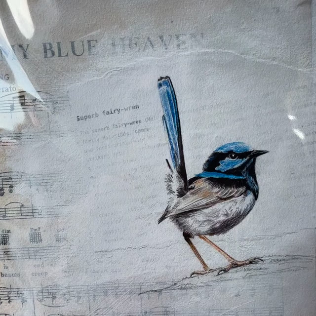 This is a Giclee print of the original artwork by Nancy Tost. This series of artwork is based on the song of nature and how we interact with it. Birds are natures song and so the music sheet relates to the wonderous sounds of what we often take for granted.