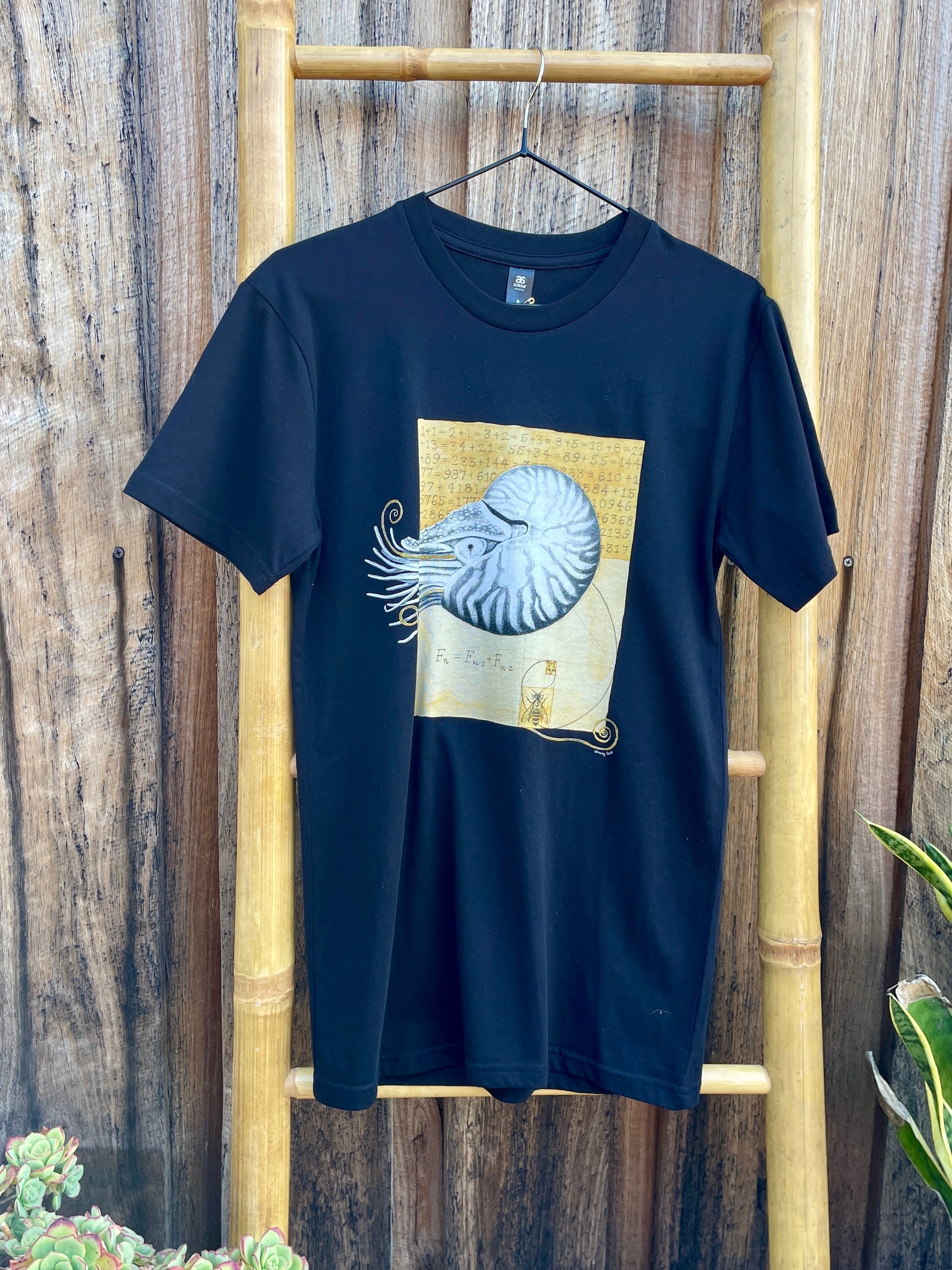 The chambered nautilus hasn't changed much over 500 million years, that why it's called a living fossil. When you slice the shell open you will find a series of chambers that make up a perfect spiral... the Fibonacci sequence in all its glory! The sequence being the inspiration for this artwork and also my love for the Nautilus shell.