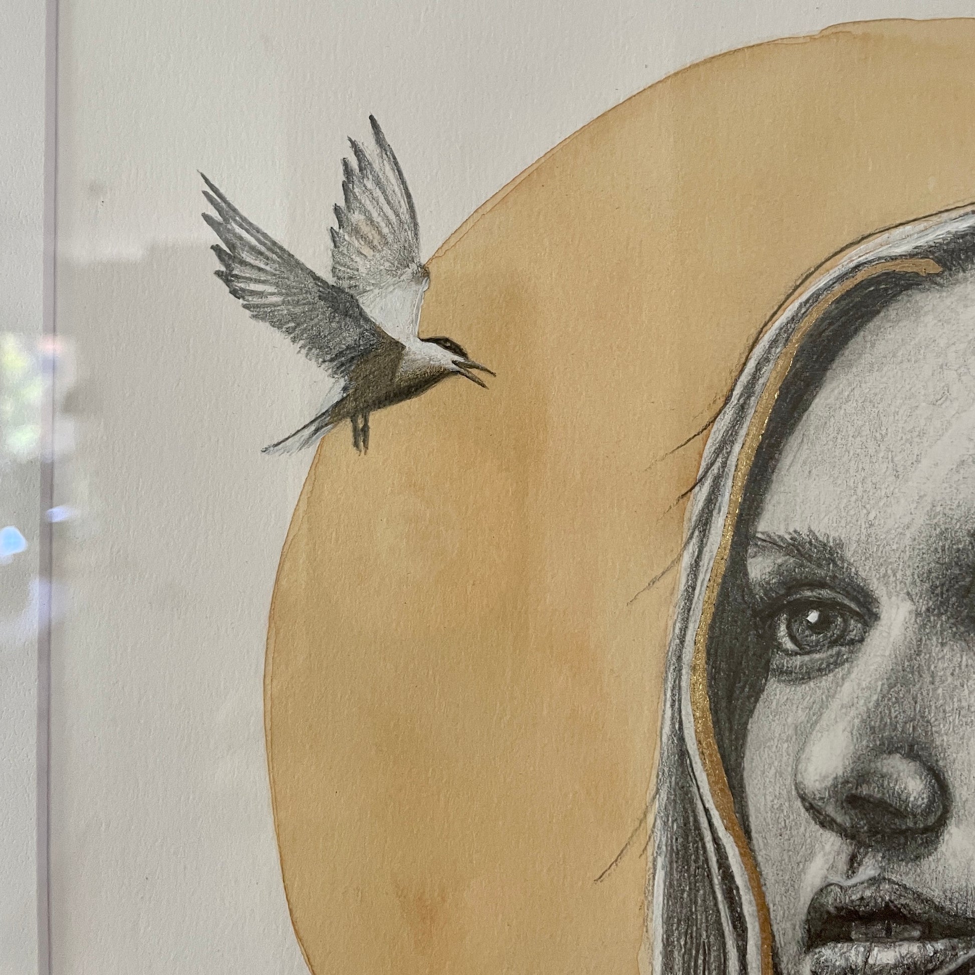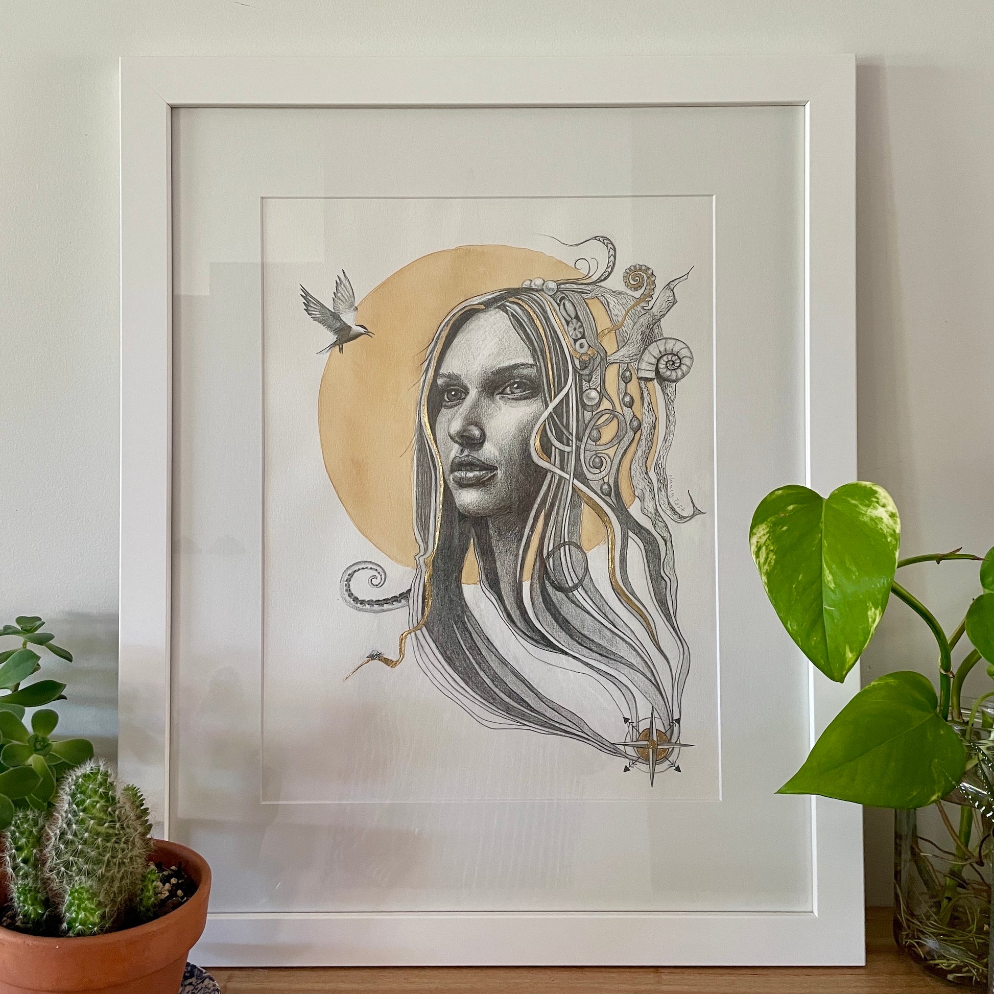 The Sea Siren drawing started in a caravan in Denmark while we were on an Easter break. She's unique, beautiful, powerful and a protector of the sea! This is a graphite drawing with rooibos tea and gold leafing. It is professionally framed by Blue Wren Framers in Dunsborough with a painted white timber frame and white mat board.
