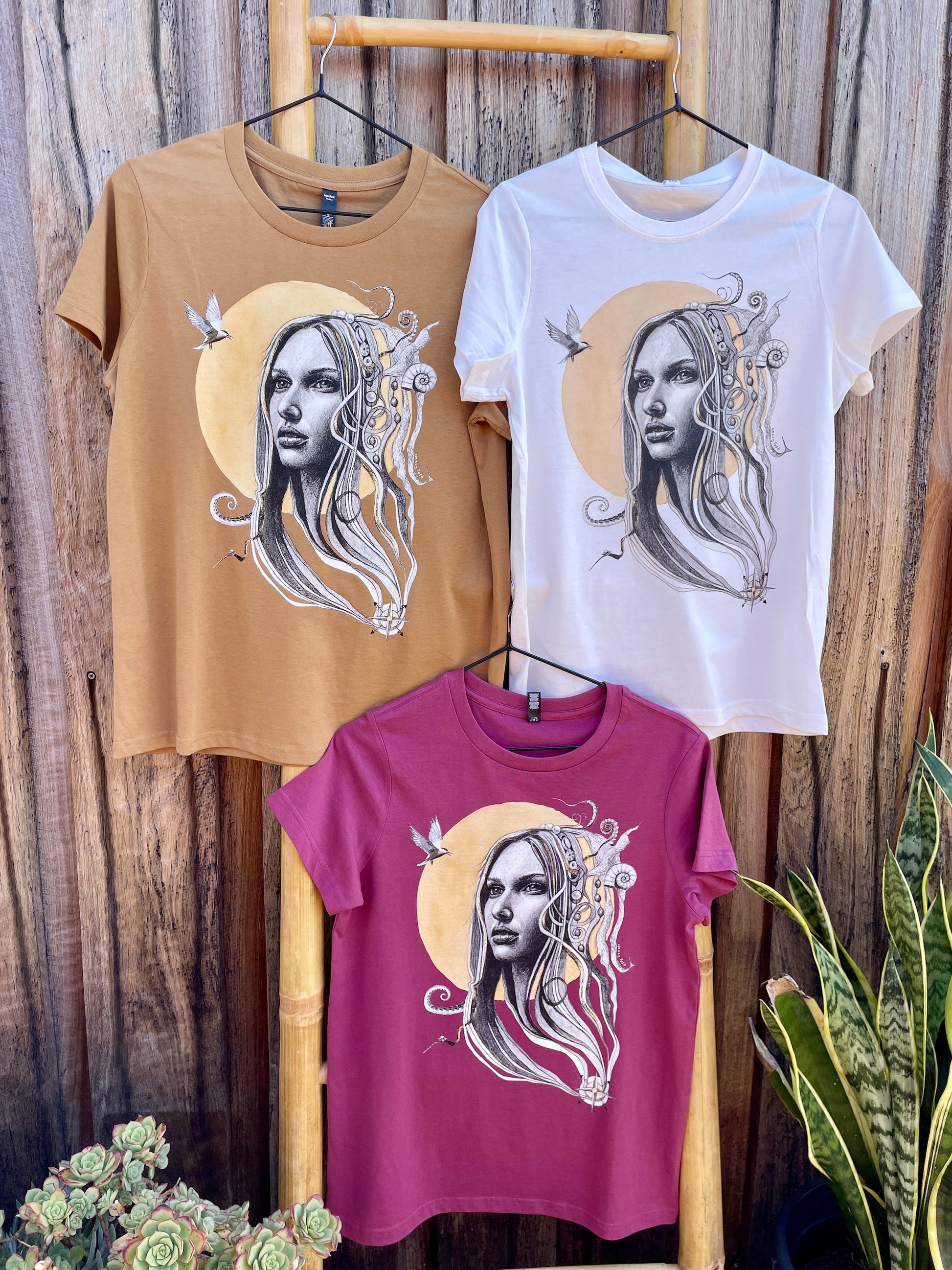 The Sea Siren design started in a caravan in Denmark while we were on an Easter break. She's unique, beautiful, powerful and a protector of the sea! The natural and black tees have some sizes available on ORGANIC cotton.