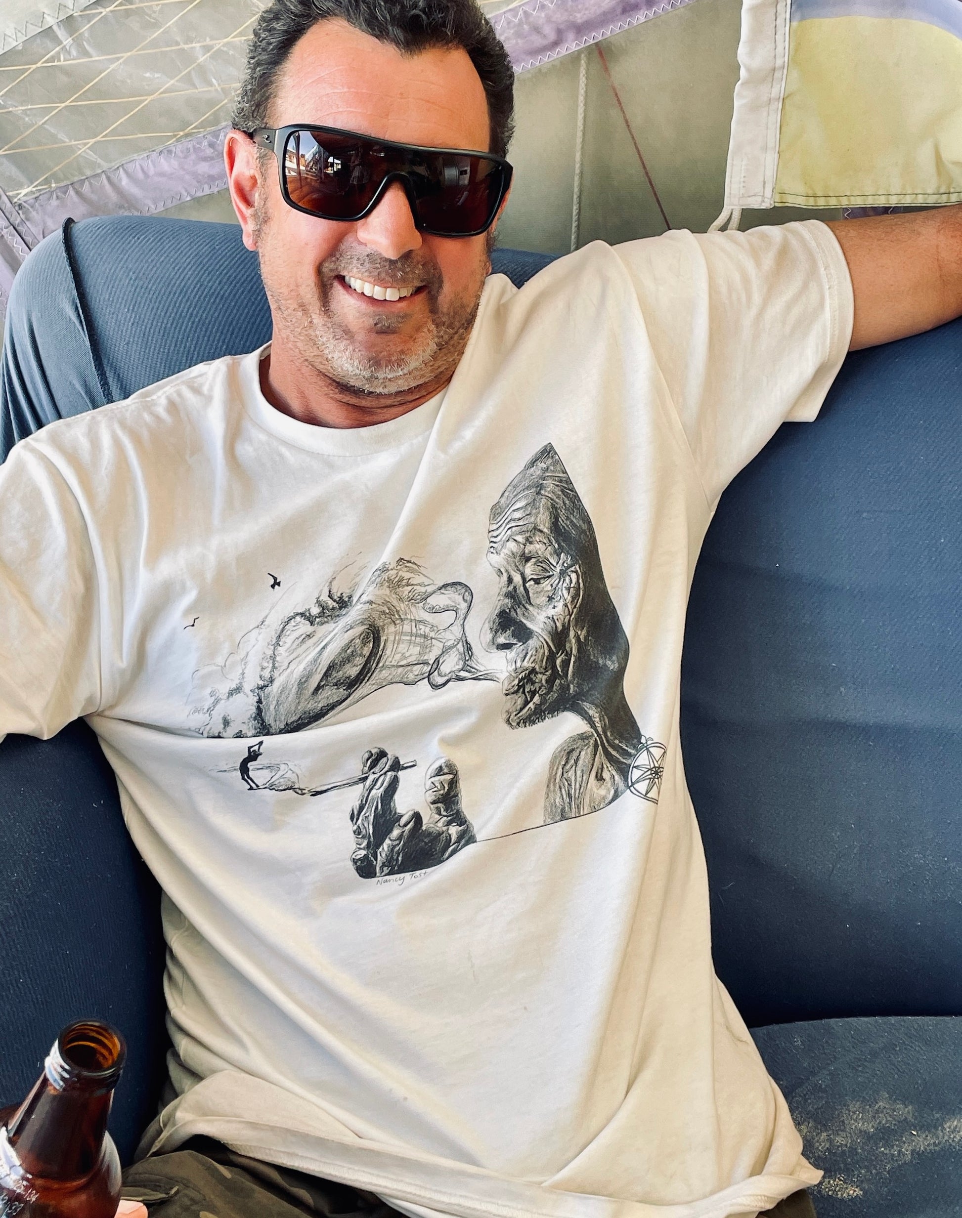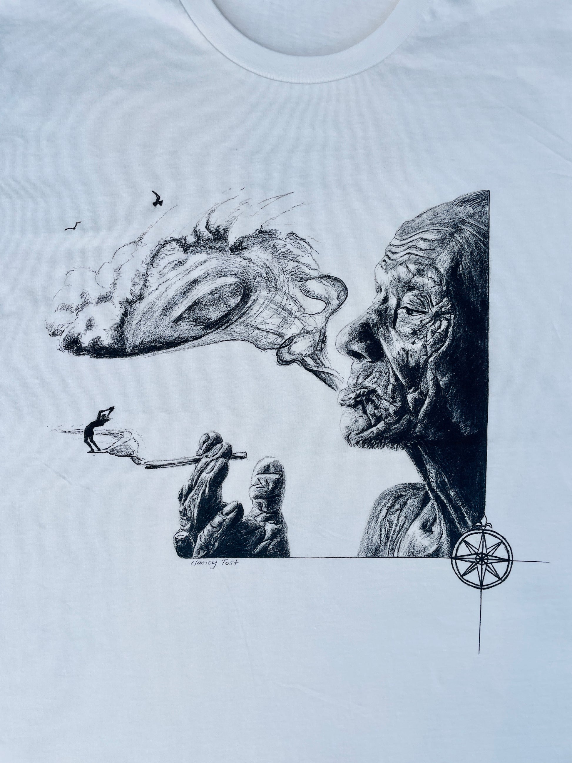 This tee is about story telling. I'm sure this guy has a few. The nautical/ocean theme is integrated into this drawing as it was originally a commission for a local surf shop and because I love to surf like most of us here in SW WA.