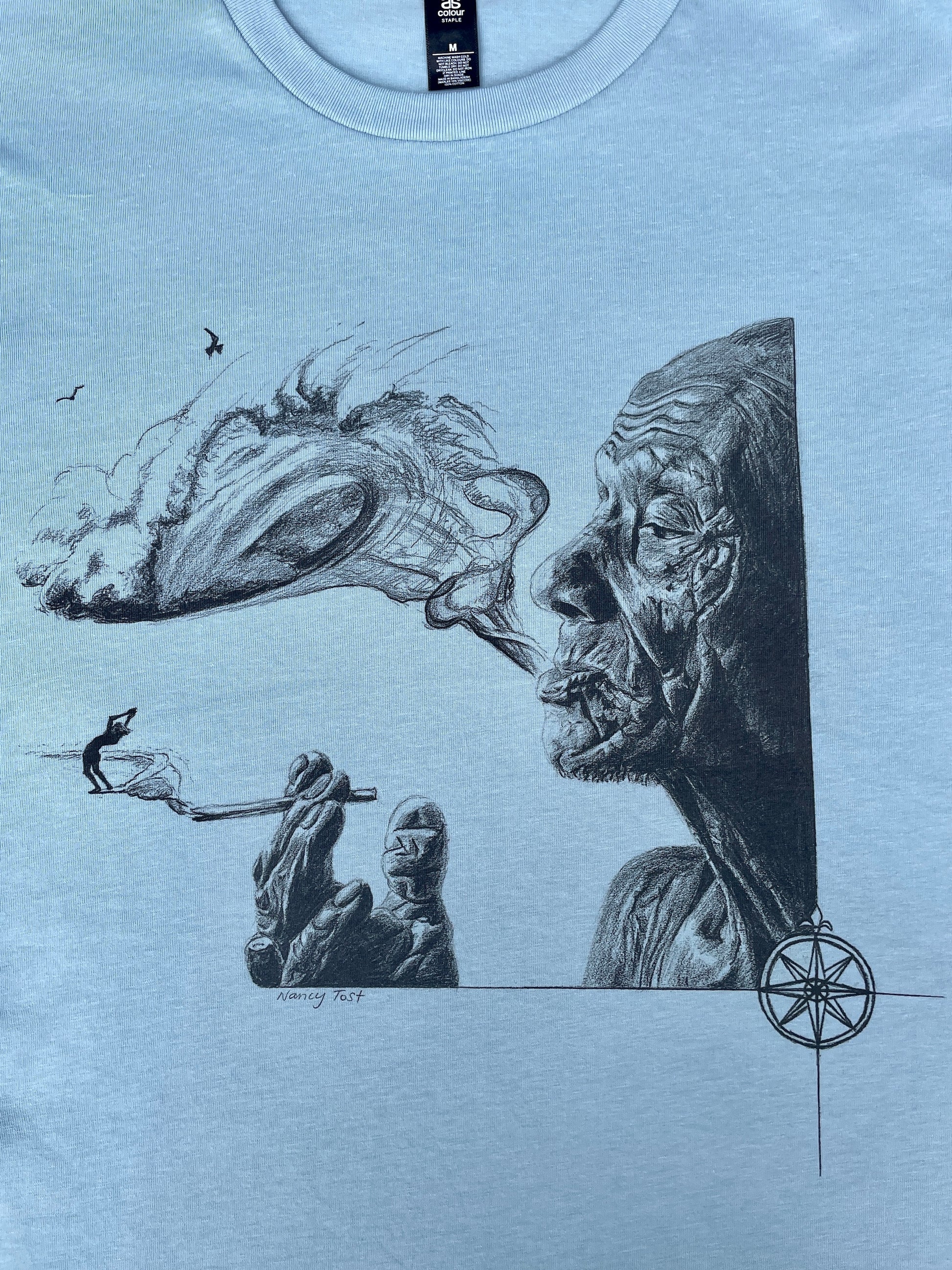 This tee is about story telling. I'm sure this guy has a few. The nautical/ocean theme is integrated into this drawing as it was originally a commission for a local surf shop and because I love to surf like most of us here in SW WA.